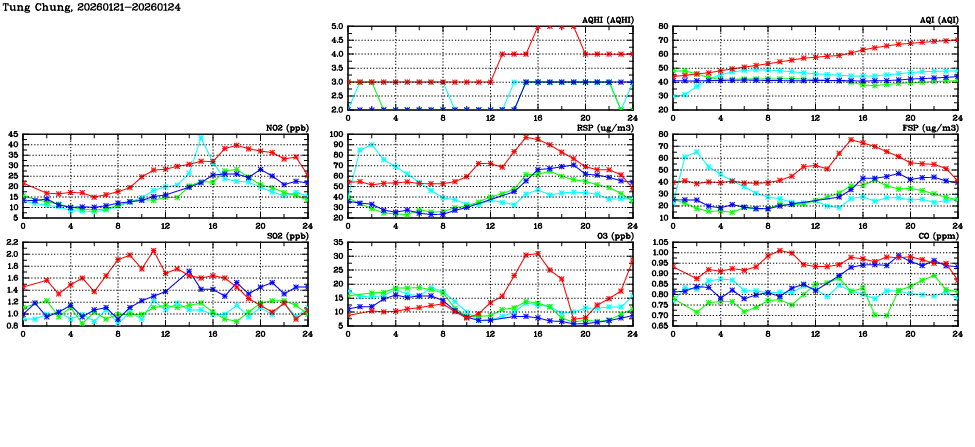| Air Quality Data Time Series in Tung Chung (2026/01/24) | ( Line colors: Day -3 Day -2 Day -1 Current day ) | 2D Map Current AQHI |