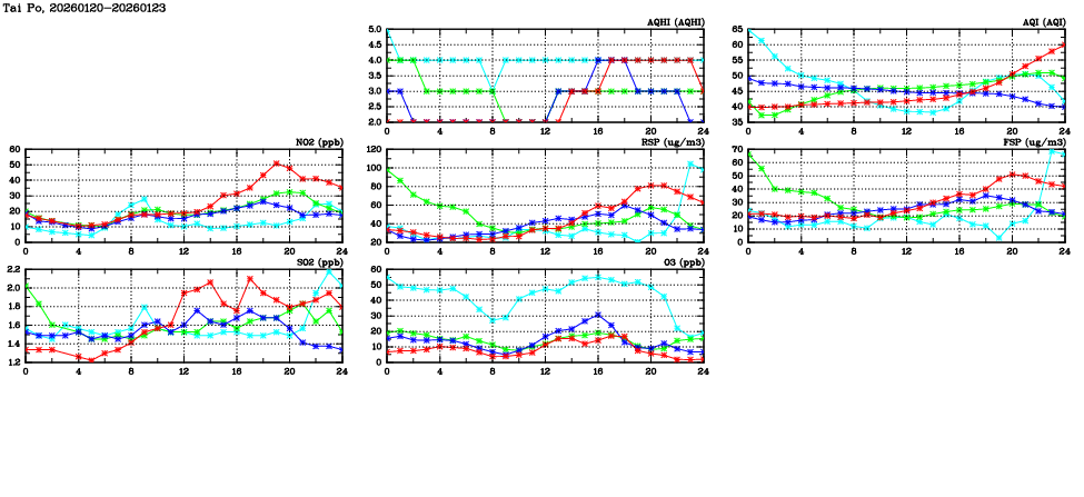 | Air Quality Data Time Series in Tai Po (2026/01/23) | ( Line colors: Day -3 Day -2 Day -1 Current day ) | 2D Map Current AQHI |