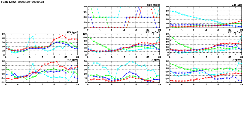 | Air Quality Data Time Series in Yuen Long (2026/01/23) | ( Line colors: Day -3 Day -2 Day -1 Current day ) | 2D Map Current AQHI |