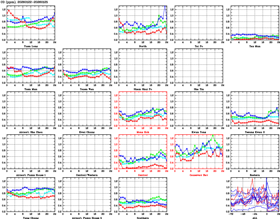 | Air Quality Data Time Series for CO (2026/01/25) | ( Line colors: Day -3 Day -2 Day -1 Current day ) | 2D Map Current AQHI |