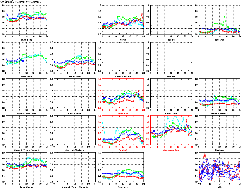 | Air Quality Data Time Series for CO (2026/01/30) | ( Line colors: Day -3 Day -2 Day -1 Current day ) | 2D Map Current AQHI |