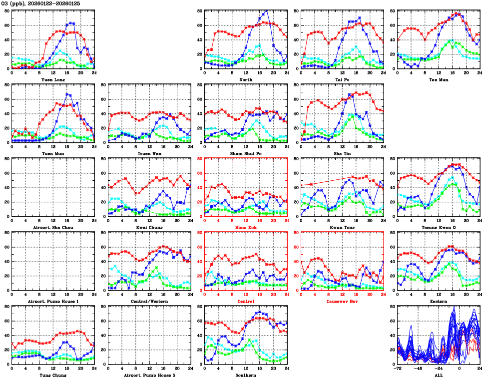 | Air Quality Data Time Series for O3 (2026/01/25) | ( Line colors: Day -3 Day -2 Day -1 Current day ) | 2D Map Current AQHI |