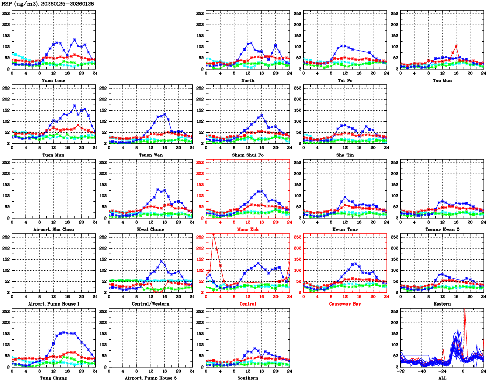 | Air Quality Data Time Series for RSP (2026/01/28) | ( Line colors: Day -3 Day -2 Day -1 Current day ) | 2D Map Current AQHI |