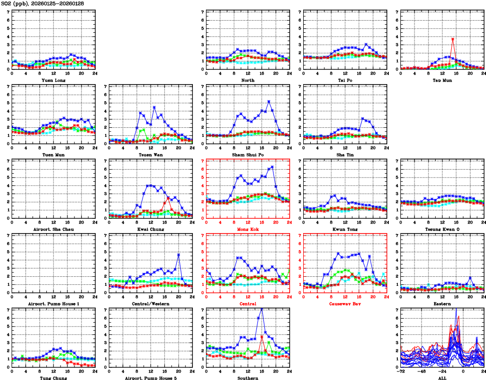 | Air Quality Data Time Series for SO2 (2026/01/28) | ( Line colors: Day -3 Day -2 Day -1 Current day ) | 2D Map Current AQHI |