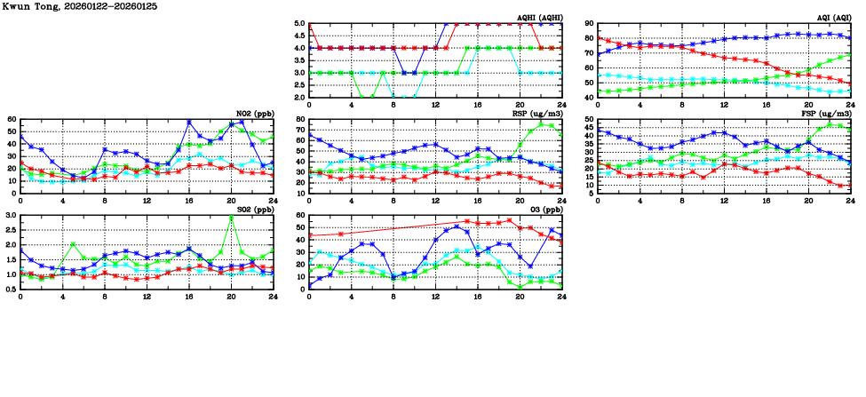 | Air Quality Data Time Series in Kwun Tong (2026/01/25) | ( Line colors: Day -3 Day -2 Day -1 Current day ) | 2D Map Current AQHI |