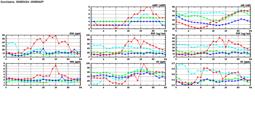 | Air Quality Data Time Series in Southern (2026/01/27) | ( Line colors: Day -3 Day -2 Day -1 Current day ) | 2D Map Current AQHI |
