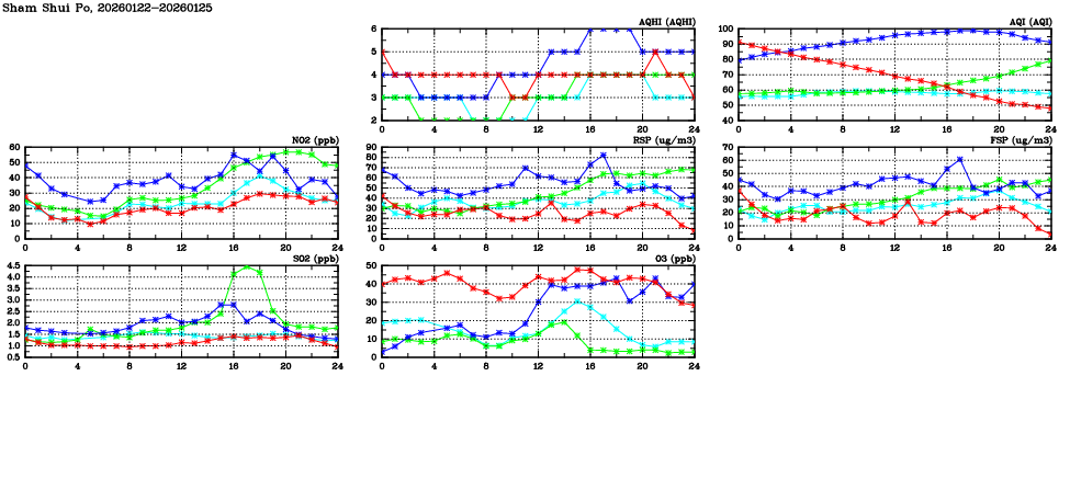 | Air Quality Data Time Series in Sham Shui Po (2026/01/25) | ( Line colors: Day -3 Day -2 Day -1 Current day ) | 2D Map Current AQHI |
