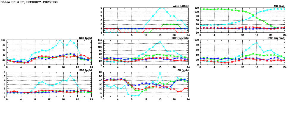 | Air Quality Data Time Series in Sham Shui Po (2026/01/30) | ( Line colors: Day -3 Day -2 Day -1 Current day ) | 2D Map Current AQHI |
