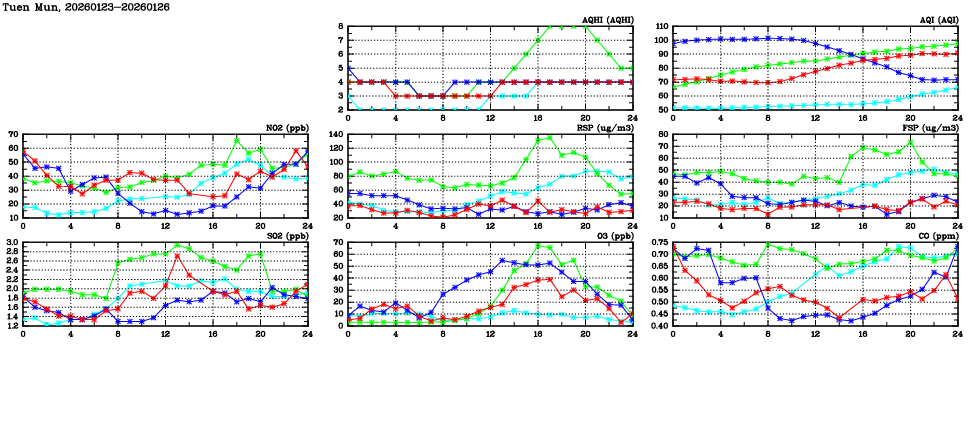 | Air Quality Data Time Series in Tuen Mun (2026/01/26) | ( Line colors: Day -3 Day -2 Day -1 Current day ) | 2D Map Current AQHI |
