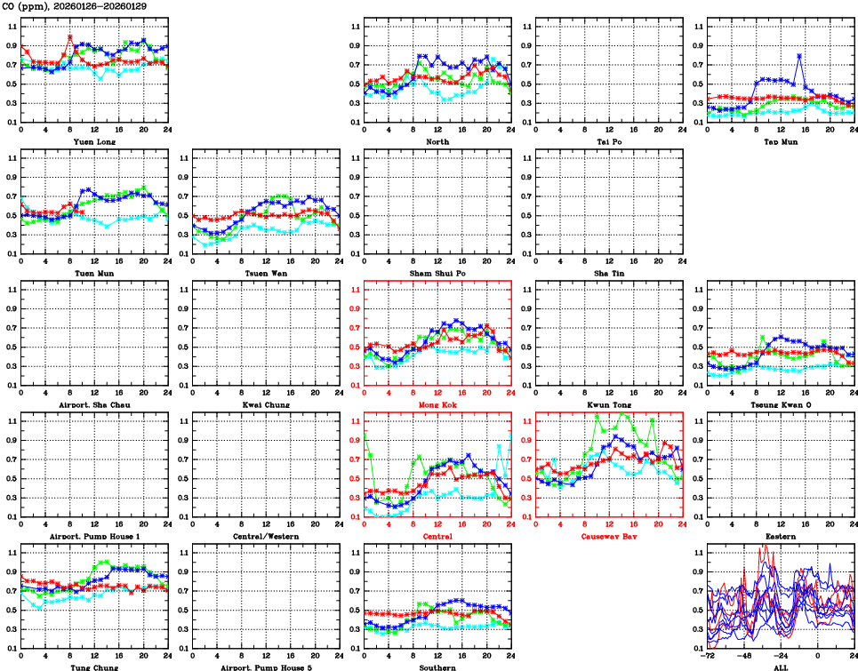 | Air Quality Data Time Series for CO (2026/01/29) | ( Line colors: Day -3 Day -2 Day -1 Current day ) | 2D Map Current AQHI |