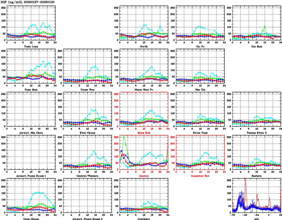 | Air Quality Data Time Series for RSP (2026/01/30) | ( Line colors: Day -3 Day -2 Day -1 Current day ) | 2D Map Current AQHI |