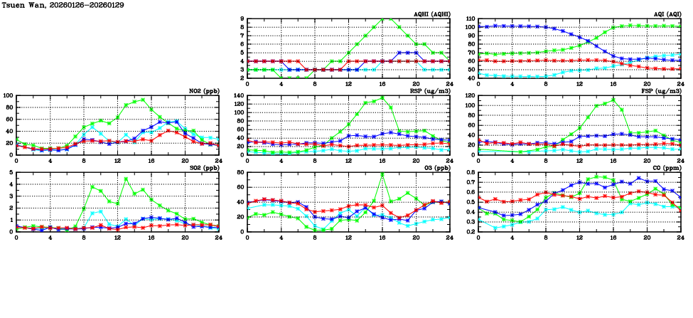 | Air Quality Data Time Series in Tsuen Wan (2026/01/29) | ( Line colors: Day -3 Day -2 Day -1 Current day ) | 2D Map Current AQHI |