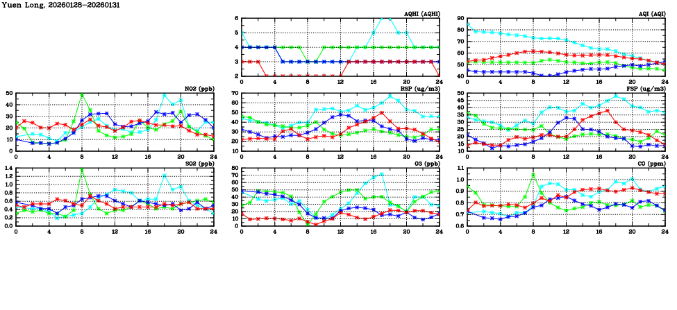 | Air Quality Data Time Series in Yuen Long (2026/01/31) | ( Line colors: Day -3 Day -2 Day -1 Current day ) | 2D Map Current AQHI |