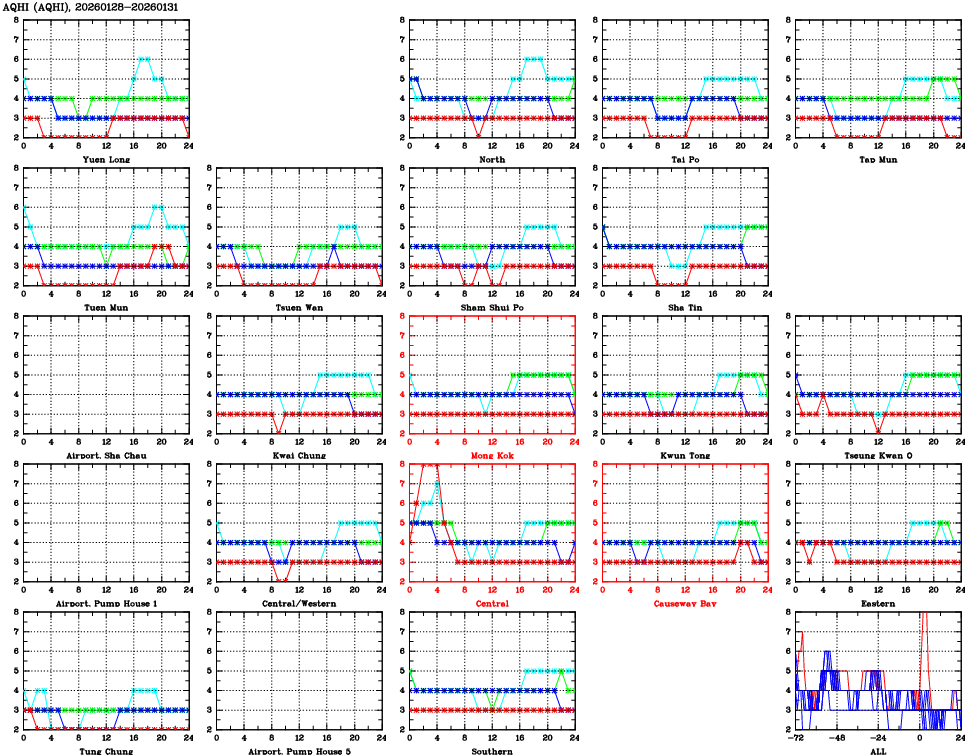 | Air Quality Data Time Series for AQHI (2026/01/31) | ( Line colors: Day -3 Day -2 Day -1 Current day ) | 2D Map Current AQHI |