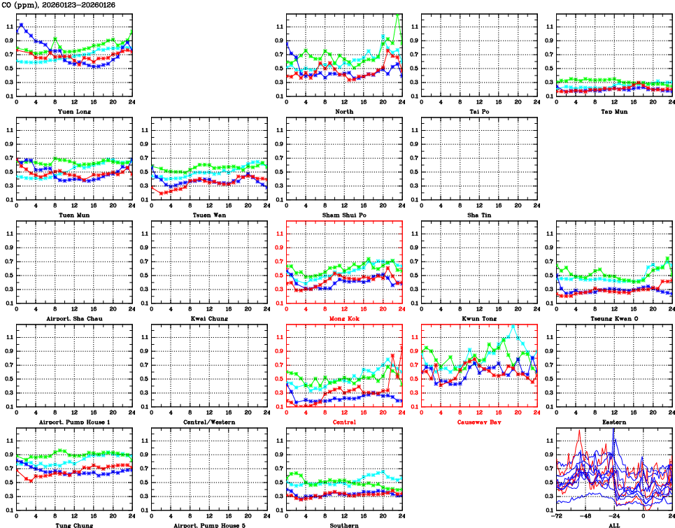 | Air Quality Data Time Series for CO (2026/01/26) | ( Line colors: Day -3 Day -2 Day -1 Current day ) | 2D Map Current AQHI |