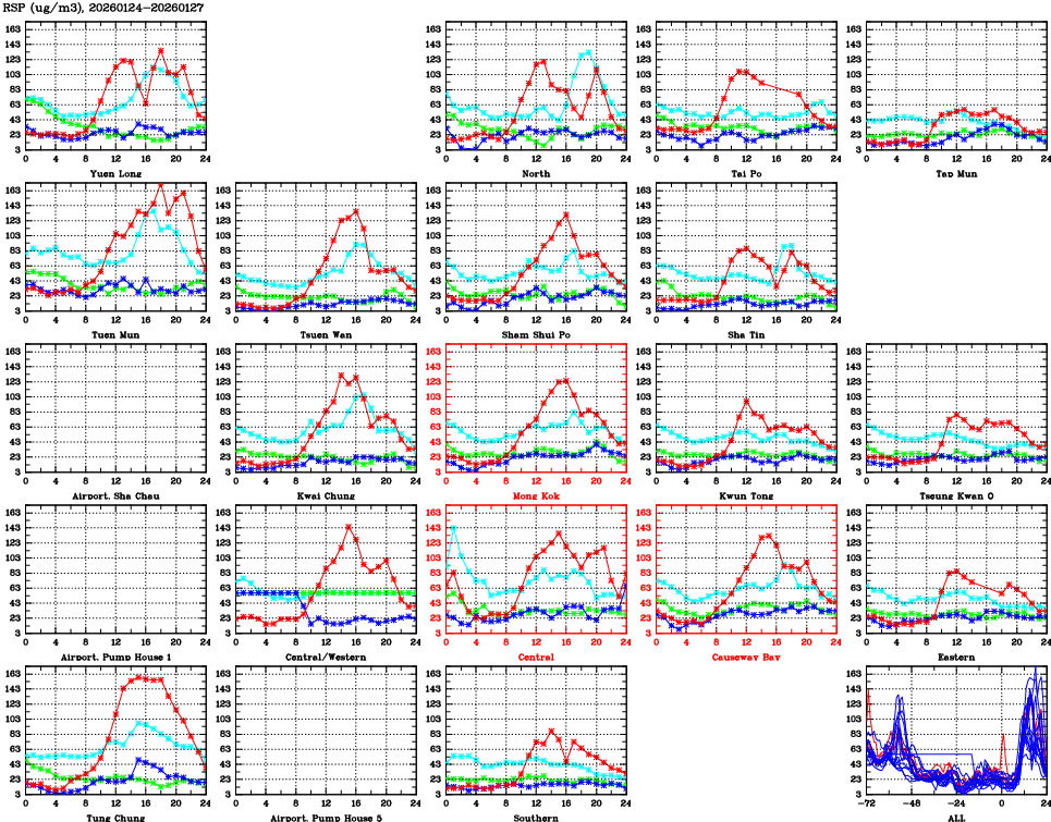 | Air Quality Data Time Series for RSP (2026/01/27) | ( Line colors: Day -3 Day -2 Day -1 Current day ) | 2D Map Current AQHI |