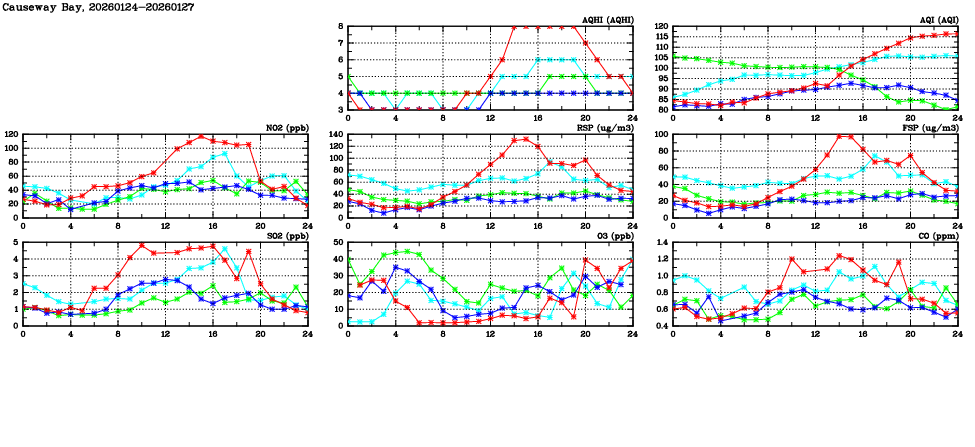 | Air Quality Data Time Series in Causeway Bay (2026/01/27) | ( Line colors: Day -3 Day -2 Day -1 Current day ) | 2D Map Current AQHI |