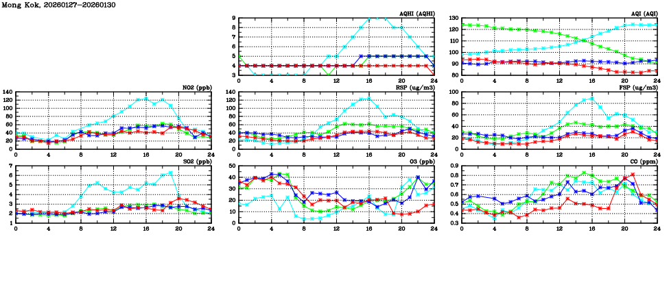 | Air Quality Data Time Series in Mong Kok (2026/01/30) | ( Line colors: Day -3 Day -2 Day -1 Current day ) | 2D Map Current AQHI |