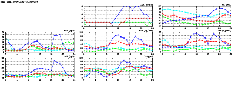 | Air Quality Data Time Series in Sha Tin (2026/01/28) | ( Line colors: Day -3 Day -2 Day -1 Current day ) | 2D Map Current AQHI |