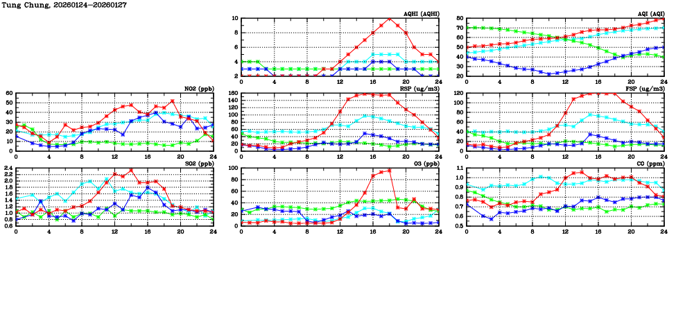 | Air Quality Data Time Series in Tung Chung (2026/01/27) | ( Line colors: Day -3 Day -2 Day -1 Current day ) | 2D Map Current AQHI |