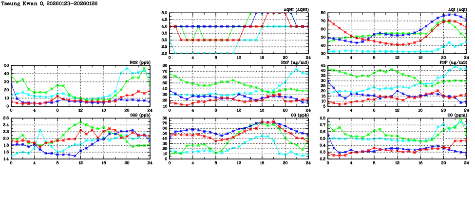| Air Quality Data Time Series in Tseung Kwan O (2026/01/26) | ( Line colors: Day -3 Day -2 Day -1 Current day ) | 2D Map Current AQHI |