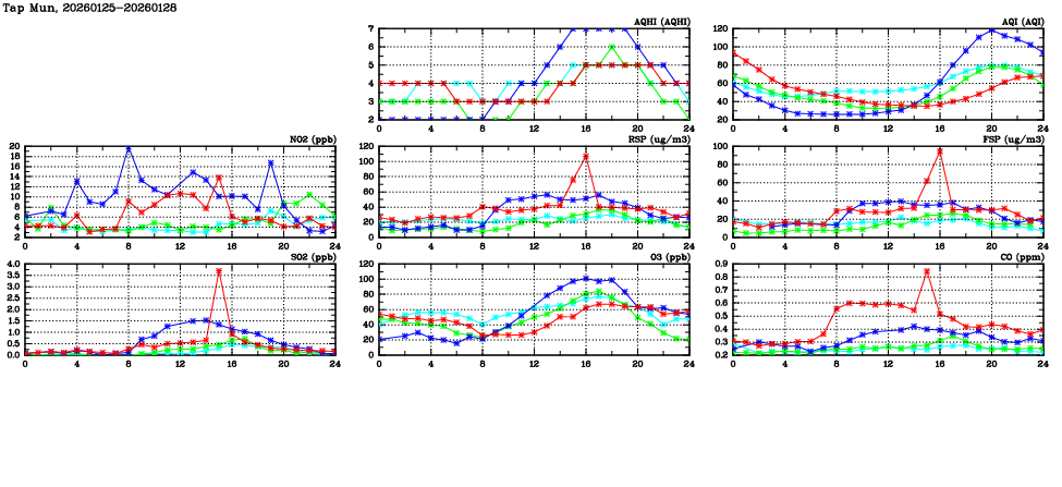 | Air Quality Data Time Series in Tap Mun (2026/01/28) | ( Line colors: Day -3 Day -2 Day -1 Current day ) | 2D Map Current AQHI |