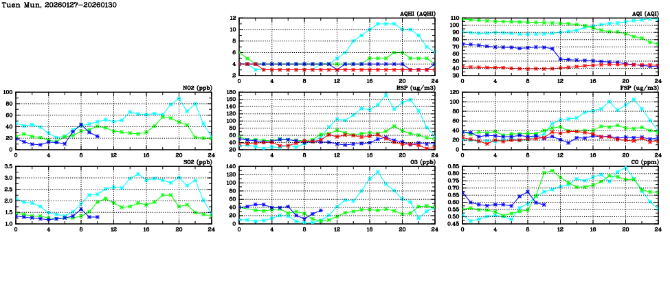 | Air Quality Data Time Series in Tuen Mun (2026/01/30) | ( Line colors: Day -3 Day -2 Day -1 Current day ) | 2D Map Current AQHI |