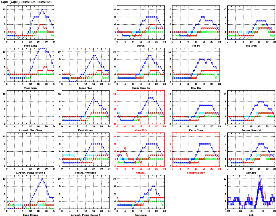 | Air Quality Data Time Series for AQHI (2026/01/28) | ( Line colors: Day -3 Day -2 Day -1 Current day ) | 2D Map Current AQHI |