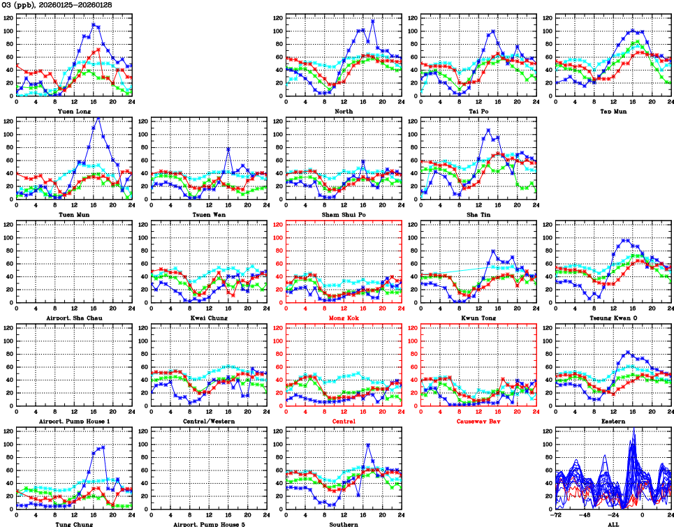 | Air Quality Data Time Series for O3 (2026/01/28) | ( Line colors: Day -3 Day -2 Day -1 Current day ) | 2D Map Current AQHI |