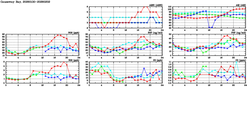 | Air Quality Data Time Series in Causeway Bay (2026/02/02) | ( Line colors: Day -3 Day -2 Day -1 Current day ) | 2D Map Current AQHI |