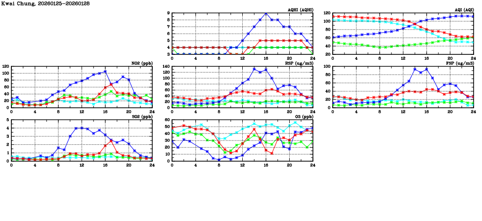 | Air Quality Data Time Series in Kwai Chung (2026/01/28) | ( Line colors: Day -3 Day -2 Day -1 Current day ) | 2D Map Current AQHI |