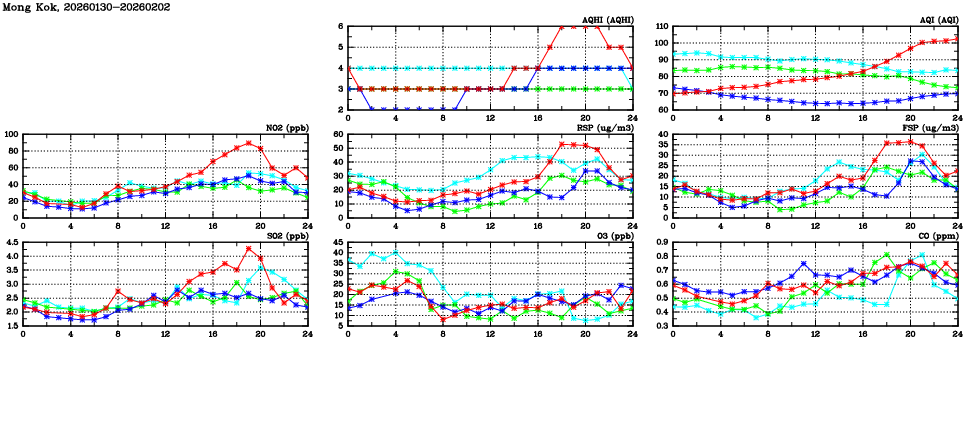 | Air Quality Data Time Series in Mong Kok (2026/02/02) | ( Line colors: Day -3 Day -2 Day -1 Current day ) | 2D Map Current AQHI |