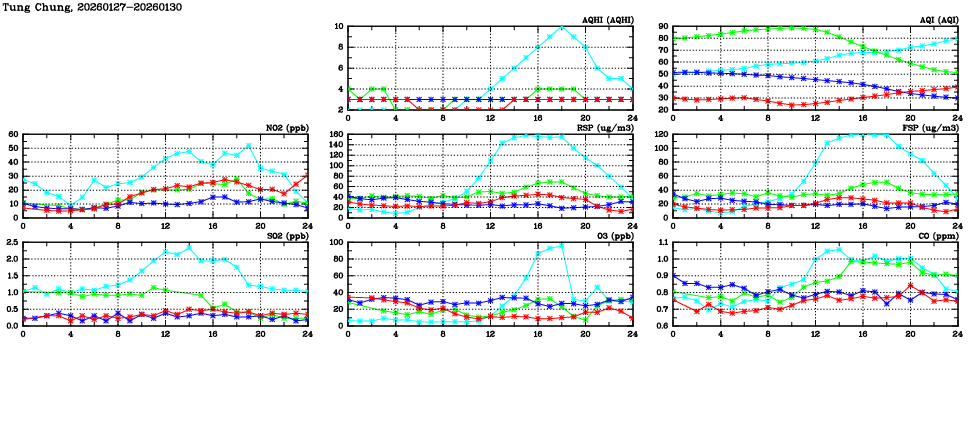 | Air Quality Data Time Series in Tung Chung (2026/01/30) | ( Line colors: Day -3 Day -2 Day -1 Current day ) | 2D Map Current AQHI |