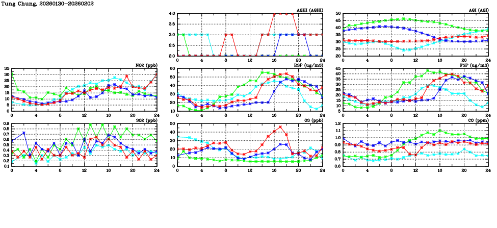 | Air Quality Data Time Series in Tung Chung (2026/02/02) | ( Line colors: Day -3 Day -2 Day -1 Current day ) | 2D Map Current AQHI |