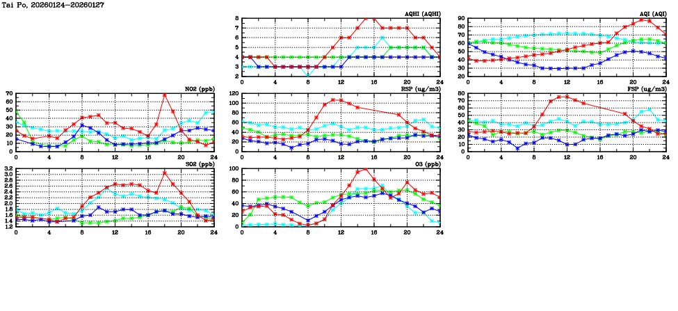 | Air Quality Data Time Series in Tai Po (2026/01/27) | ( Line colors: Day -3 Day -2 Day -1 Current day ) | 2D Map Current AQHI |