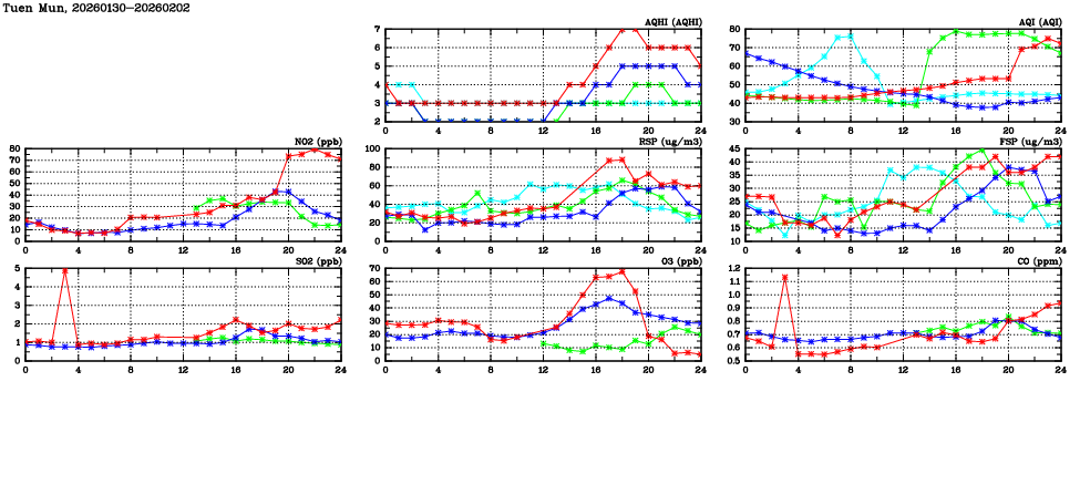 | Air Quality Data Time Series in Tuen Mun (2026/02/02) | ( Line colors: Day -3 Day -2 Day -1 Current day ) | 2D Map Current AQHI |