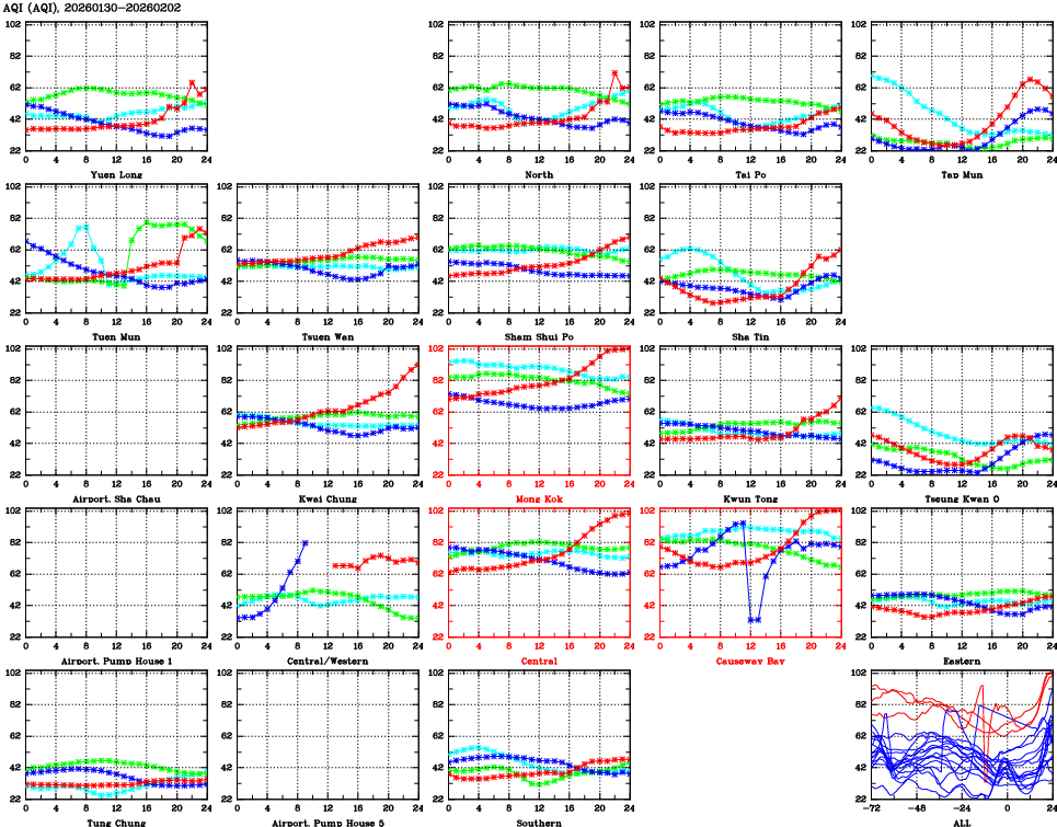 | Air Quality Data Time Series for AQI (2026/02/02) | ( Line colors: Day -3 Day -2 Day -1 Current day ) | 2D Map Current AQHI |