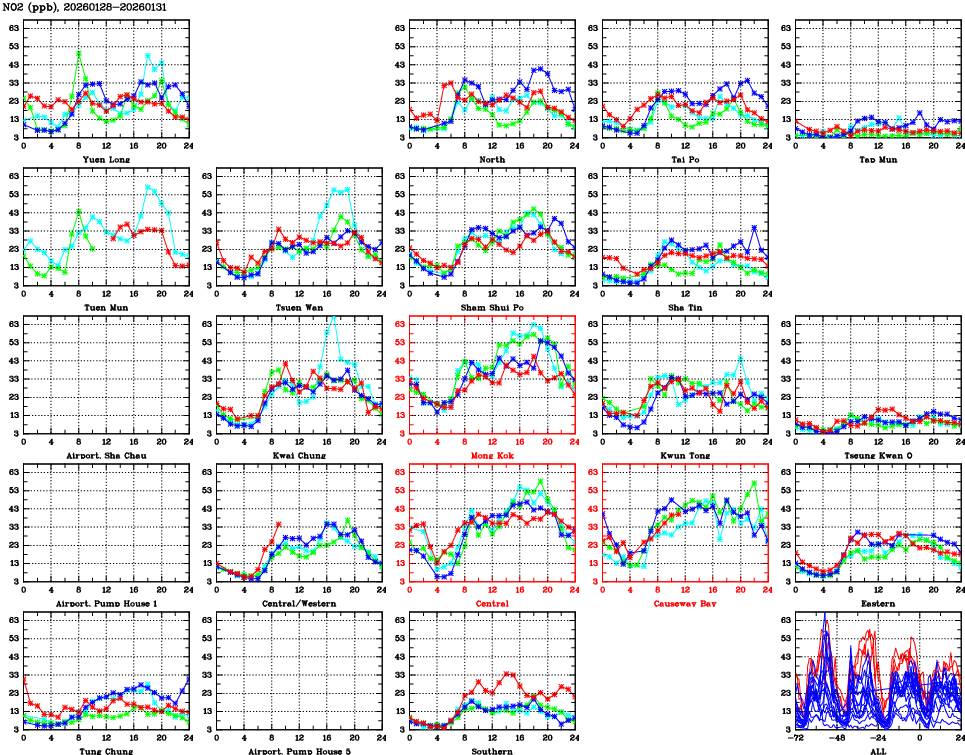 | Air Quality Data Time Series for NO2 (2026/01/31) | ( Line colors: Day -3 Day -2 Day -1 Current day ) | 2D Map Current AQHI |