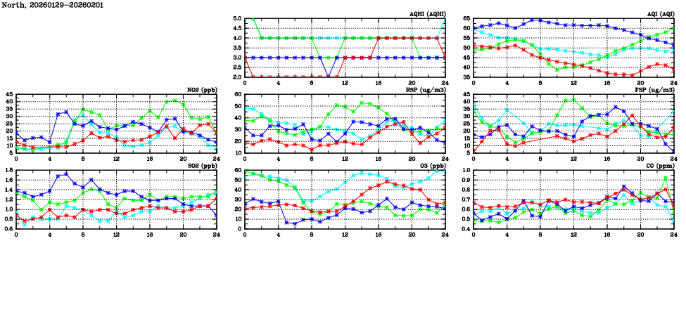 | Air Quality Data Time Series in North (2026/02/01) | ( Line colors: Day -3 Day -2 Day -1 Current day ) | 2D Map Current AQHI |