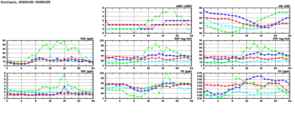 | Air Quality Data Time Series in Southern (2026/01/29) | ( Line colors: Day -3 Day -2 Day -1 Current day ) | 2D Map Current AQHI |