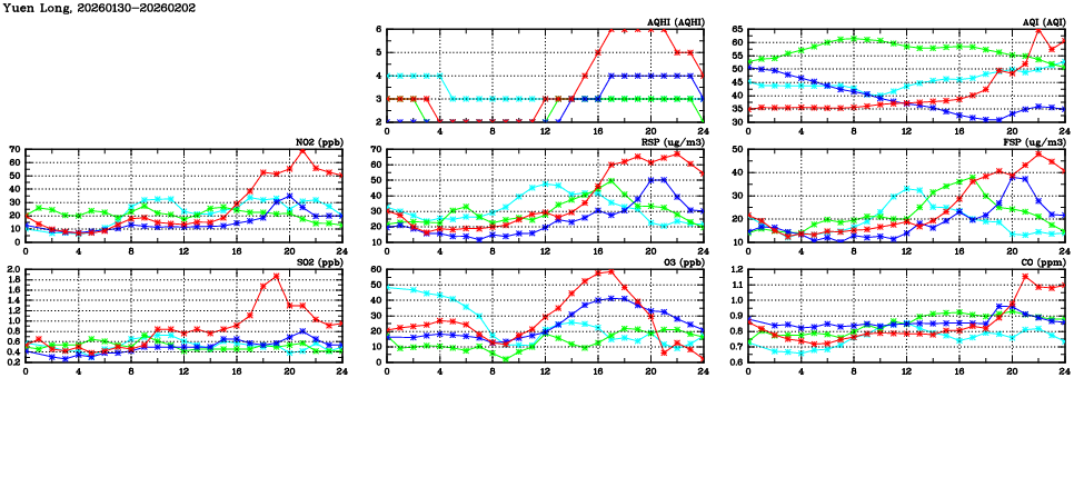 | Air Quality Data Time Series in Yuen Long (2026/02/02) | ( Line colors: Day -3 Day -2 Day -1 Current day ) | 2D Map Current AQHI |