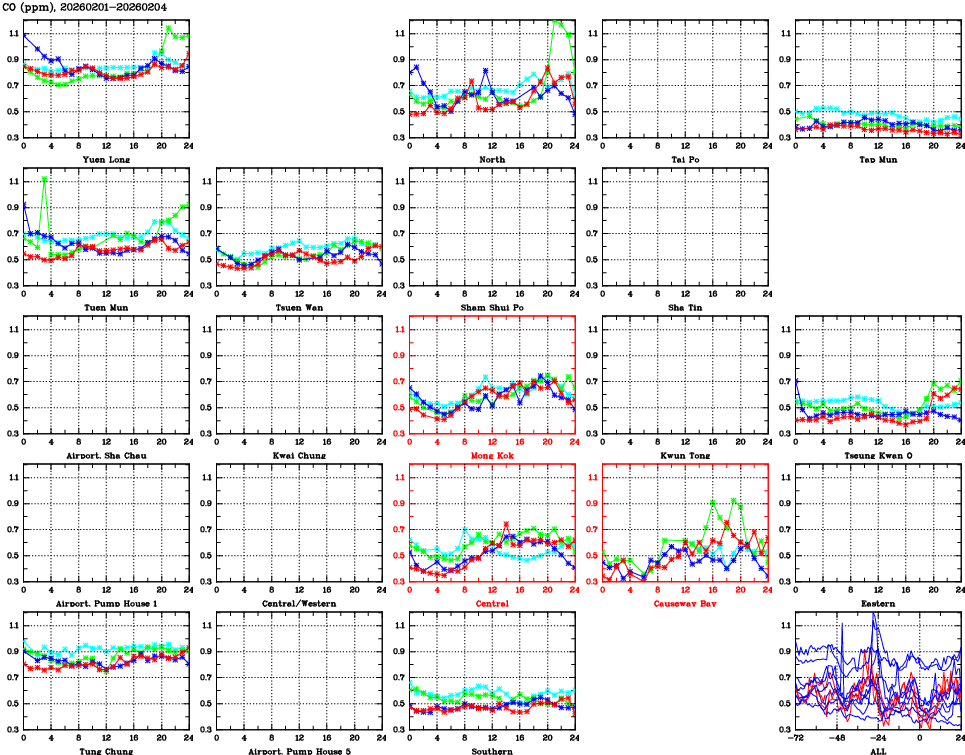 | Air Quality Data Time Series for CO (2026/02/04) | ( Line colors: Day -3 Day -2 Day -1 Current day ) | 2D Map Current AQHI |