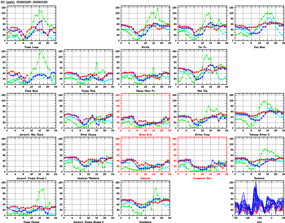 | Air Quality Data Time Series for O3 (2026/01/29) | ( Line colors: Day -3 Day -2 Day -1 Current day ) | 2D Map Current AQHI |
