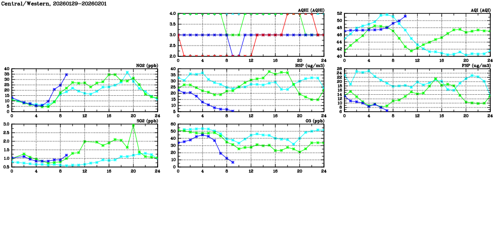 | Air Quality Data Time Series in Central/Western (2026/02/01) | ( Line colors: Day -3 Day -2 Day -1 Current day ) | 2D Map Current AQHI |