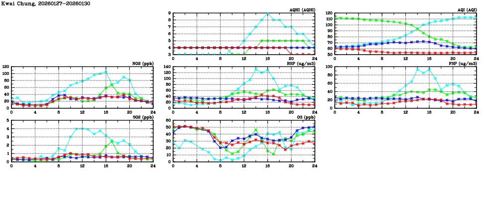 | Air Quality Data Time Series in Kwai Chung (2026/01/30) | ( Line colors: Day -3 Day -2 Day -1 Current day ) | 2D Map Current AQHI |