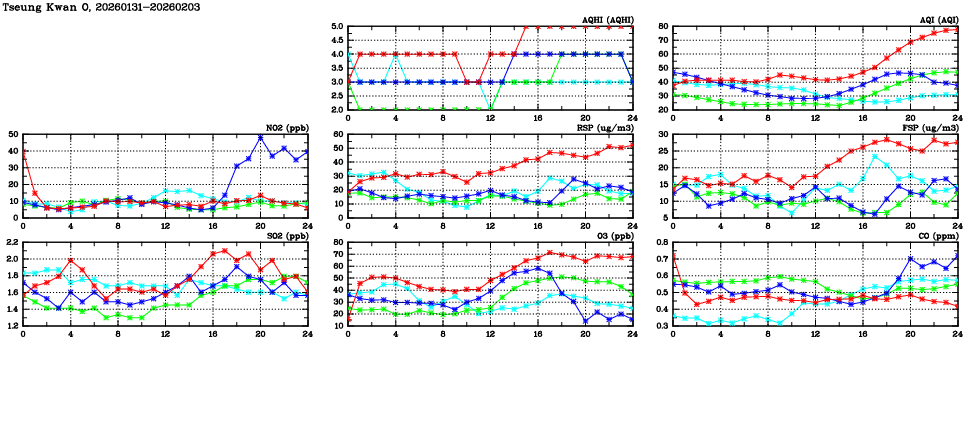 | Air Quality Data Time Series in Tseung Kwan O (2026/02/03) | ( Line colors: Day -3 Day -2 Day -1 Current day ) | 2D Map Current AQHI |