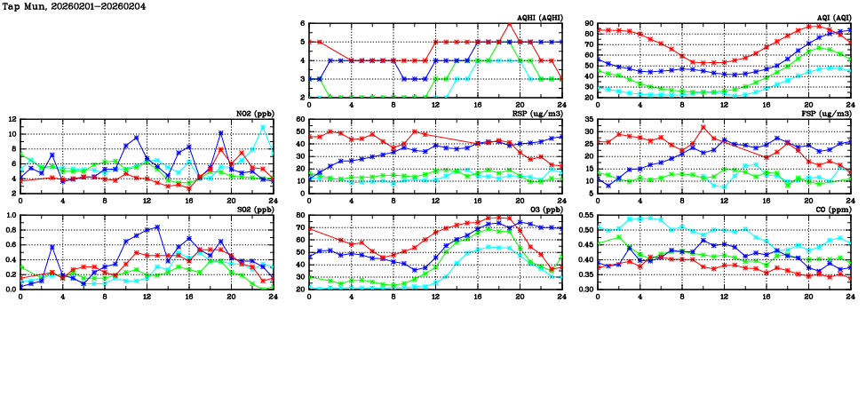 | Air Quality Data Time Series in Tap Mun (2026/02/04) | ( Line colors: Day -3 Day -2 Day -1 Current day ) | 2D Map Current AQHI |