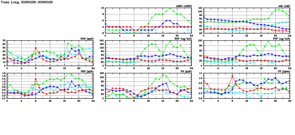 | Air Quality Data Time Series in Yuen Long (2026/01/29) | ( Line colors: Day -3 Day -2 Day -1 Current day ) | 2D Map Current AQHI |