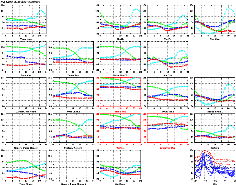 | Air Quality Data Time Series for AQI (2026/01/30) | ( Line colors: Day -3 Day -2 Day -1 Current day ) | 2D Map Current AQHI |