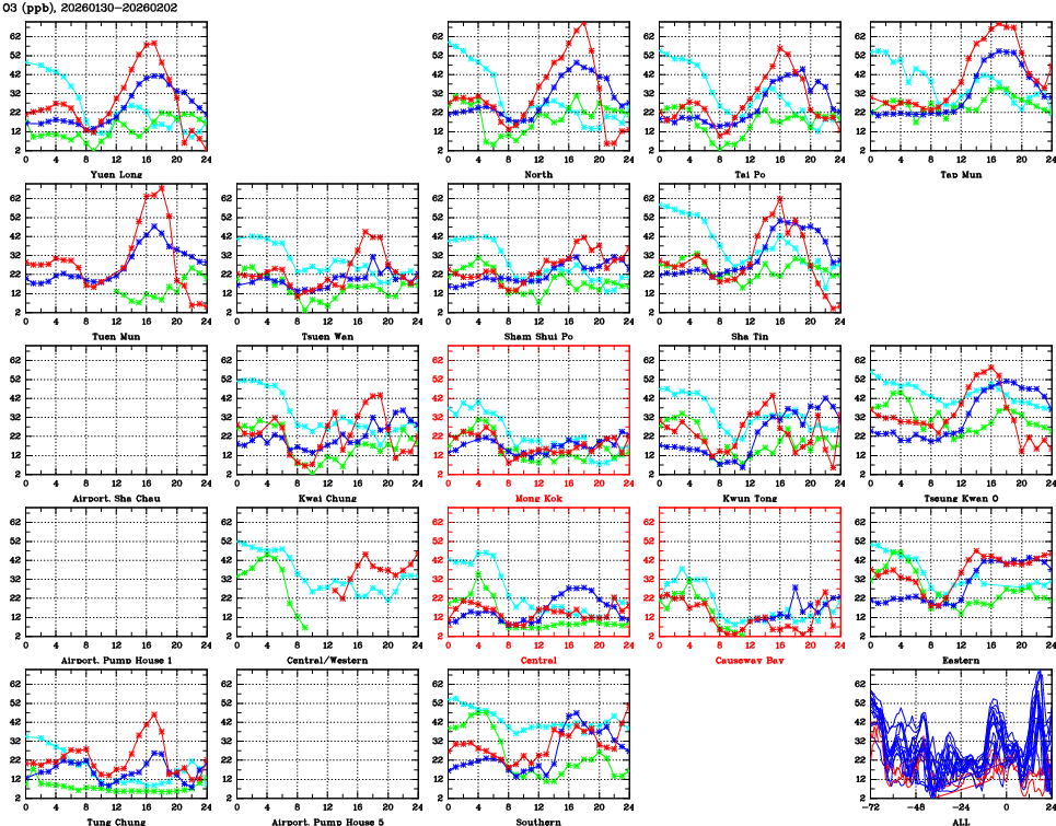 | Air Quality Data Time Series for O3 (2026/02/02) | ( Line colors: Day -3 Day -2 Day -1 Current day ) | 2D Map Current AQHI |